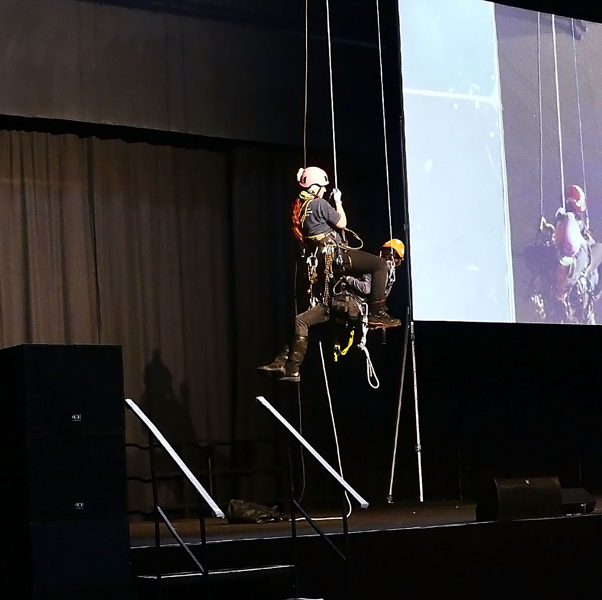 Falls es im Seil doch einmal zur Notsituation kommt, wie man sich dann zu verhalten hat, ist Thema am zweiten Tag des Technikseminars. Den Ausgangspunkt zur Praxisdemonstration bietet ein schwebendes Gerüst, das von Mitarbeitern der Rope Access Solutions GmbH extra in der Halle angebracht wurde. In rund sechs Metern Höhe ist es befestigt, zwischen den stählernen Armen eines Ladekrans, der die gesamte Bühne des Pier 2 überspannt. Von dort seilen sich Anwender ab und simulieren einen Unfall. Welcher Rettungsansatz ist jetzt der beste? PSA-Rettung mit Rettungshubgerät? Gegenseitige Kameradenrettung unter Verwendung von Seilzugangstechnik? Oder doch ein ganz anderer? Die Antworten liefert wieder Knut Foppe von Ropemission, der die Übung kommentiert. Zusammen mit Dr. Rüdiger Franz, ärztlicher Leiter des ganzheitlichen medizinischen Versorgungskonzeptes WINDEAcare, werden verschiedene Rettungsverfahren beleuchtet, Stärken und Schwächen aufgezeigt, notfallmedizinische Hintergründe geliefert und konkrete Handlungsempfehlungen gegeben. Wie sehr sich das Publikum von der Demonstration in den Bann ziehen lässt, lässt sich hören: Außer den Stimmen von Foppe und Franz ist da eigentlich kaum ein anderes Geräusch in der Halle.