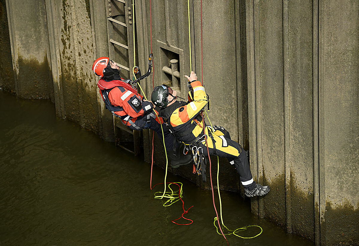 Konzentrierte Blicke richten sich auf das Geschehen im Wasser. Während die Rettungswesten der Verunglückten Luft ziehen, wartet das Team des Fast Rescue Crafts in der Nähe auf sein Startzeichen. „Unser größtes Problem ist die Zeit. Die haben wir da draussen nicht.“, sagt Thorsten Lieb, Ausbilder bei RelyOn Nutec Germany. Das liege gar nicht so sehr an der Gefahr des Auskühlens, sondern vielmehr daran, dass Menschen beim Sturz in die eisige See zur Überreaktion neigen: „Viele holen vor Schreck instinktiv Luft. Wenn sich der Kopf dabei unter Wasser befindet oder die Gischt durch schweren Wellengang permanent ins Gesicht spritzt, kann es schnell ganz kritisch werden.“, unterstreicht Knut Foppe von Ropemission, der die Demonstration zur Rettung aus dem nassen Element vom Trockenen aus überwacht und kommentiert.