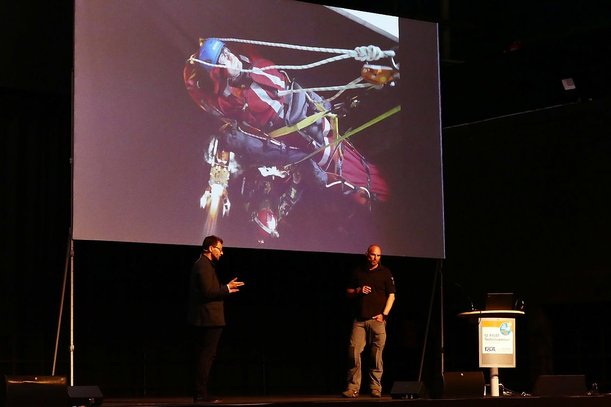 Zwei Höhenarbeiter verunglücken an einer Offshore-Windenergieanlage und landen in der Nordsee – dieses Szenario wird beim 12. FISAT-Technikseminar in Bremen Wirklichkeit. Zumindest fast! Die Kaimauer des Hafenbeckens ersetzt das Transition Piece der Anlage, das Weserwasser das des Meeres. Doch egal ob Demonstration oder Ernstfall: Einen kühlen Kopf zu bewahren und richtig zu handeln, hat immer oberste Priorität. Voraussetzungen dafür: Eine gute Ausbildung, verlässliche Abläufe und nicht zuletzt das richtige Material. Um all das geht es beim FISAT-Technikseminar, das dieses Jahr seinen inhaltlichen Schwerpunkt auf Arbeit und Rettung im Offshore-Bereich legt. Den Arbeitsbereich, der als Wiege der organisierten und gewerblichen Seilzugangs- und Positionierungstechnik (SZP) gilt.